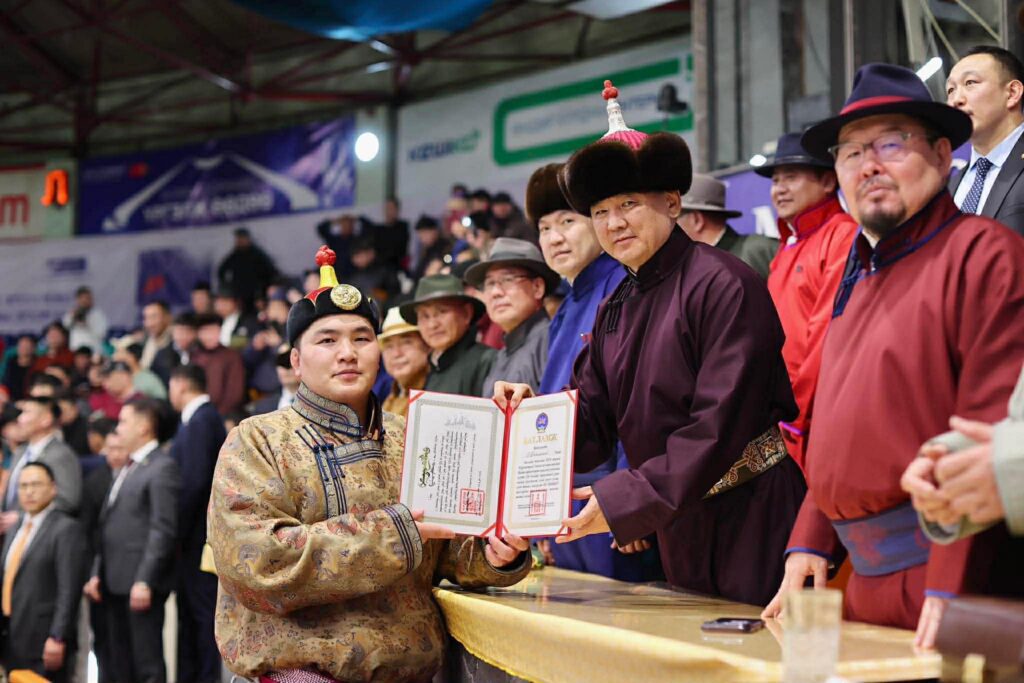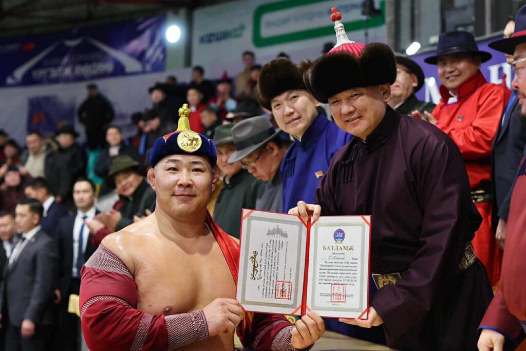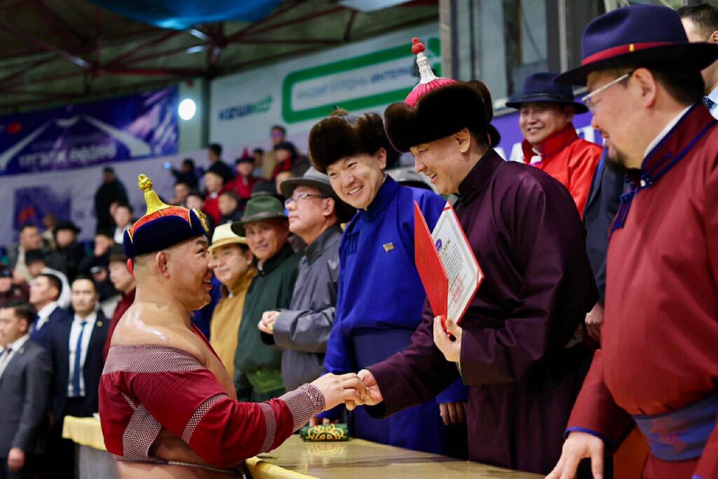 Бөхийн барилдааны наймын давааны дараа Монгол Улсын Ерөнхийлөгч Ухнаагийн Хүрэлсүх их шөвгийн дөрвөн бөхөд шагнал гардуулж, баяр хүргэлээ.