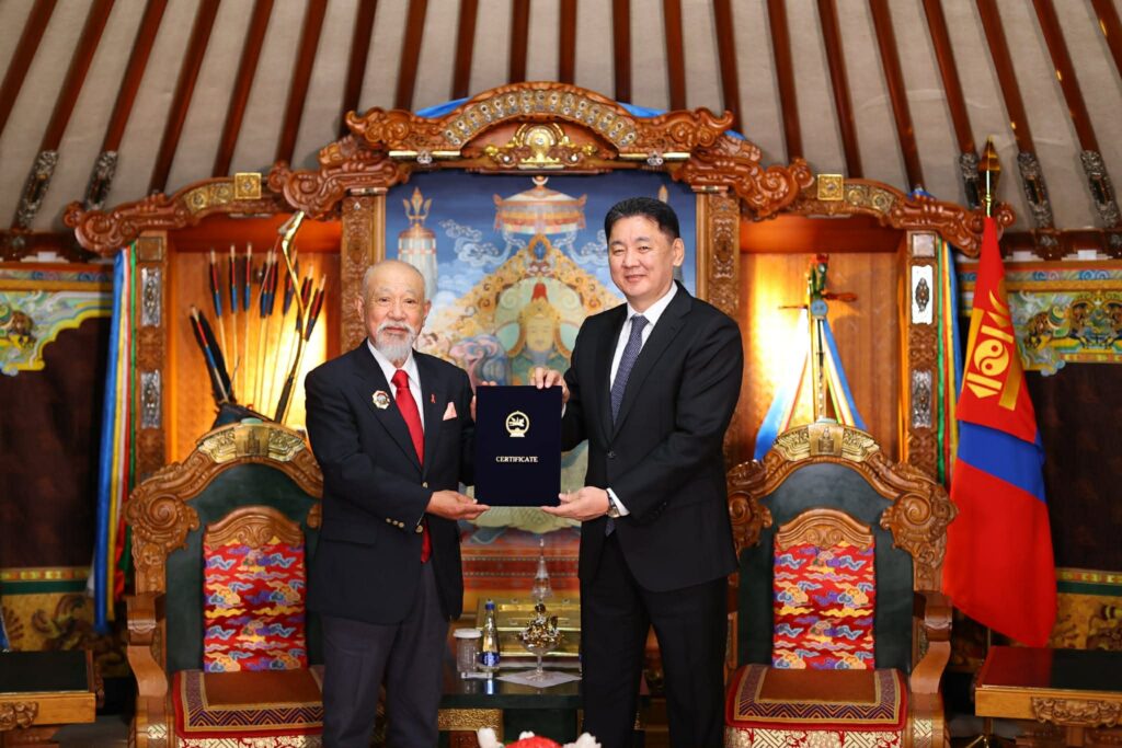Ерөнхийлөгч У.Хүрэлсүх “Ниппон сан”-гийн хүндэт тэргүүн Сасакава Ёохэи-г Хөдөлмөрийн гавьяаны улаан тугийн одон, тус сангийн тусгай зөвлөх Мори Юүжи-г Алтан гадас одонгоор шагналаа.