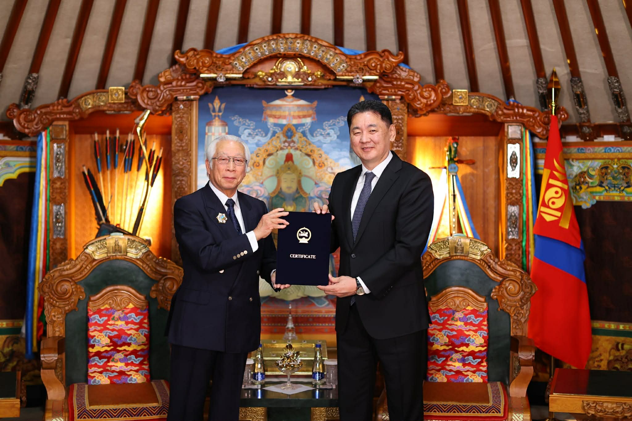 Ерөнхийлөгч У.Хүрэлсүх “Ниппон сан”-гийн хүндэт тэргүүн Сасакава Ёохэи-г Хөдөлмөрийн гавьяаны улаан тугийн одон, тус сангийн тусгай зөвлөх Мори Юүжи-г Алтан гадас одонгоор шагналаа.