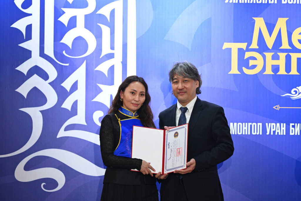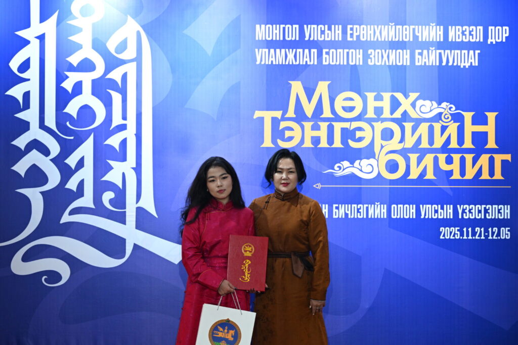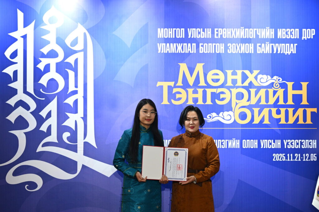 ᠡᠵᠡᠨ ᠪᠣᠭᠳᠠ ᠴᠢᠩᠬᠢᠰ ᠬᠠᠭᠠᠨ ᠤ ᠮᠡᠨᠳᠦᠯᠡᠭᠰᠡᠨ ᠡᠳᠦᠷ᠂ «ᠮᠣᠩ᠋ᠭᠤᠯ ᠪᠠᠬᠠᠷᠬᠠᠯ ᠤᠨ ᠡᠳᠦᠷ» ᠊ᠢ ᠲᠣᠬᠢᠶᠠᠯᠳᠤᠭᠤᠯᠤᠨ ᠶᠡᠷᠦᠩᠬᠡᠢᠢᠯᠡᠭᠴᠢ ᠢᠢᠨ ᠢᠪᠡᠭᠡᠯ ᠳᠣᠣᠷᠠ ᠵᠣᠬᠢᠶᠠᠨ ᠪᠠᠢᠢᠭᠤᠯᠳᠠᠭ «ᠮᠥᠩᠬᠡ ᠲᠩᠷᠢ ᠢᠢᠨ ᠪᠢᠴᠢᠭ᠌-᠒᠐᠒᠕» ᠮᠣᠩ᠋ᠭᠤᠯ ᠤᠷᠠᠨ ᠪᠢᠴᠢᠯᠭᠡ ᠢᠢᠨ ᠣᠯᠠᠨ ᠤᠯᠤᠰ ᠤᠨ ᠦᠵᠡᠰᠬᠦᠯᠡᠩ ᠦᠨ ᠨᠡᠭᠡᠭᠡᠯᠲᠡ ᠮᠣᠩ᠋ᠭᠤᠯ ᠤᠨ ᠬᠡᠦᠬᠡᠳ ᠦᠨ ᠣᠷᠳᠤᠨ ᠳᠤ ᠪᠣᠯᠤᠯᠠ᠃